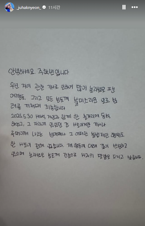 논란이 커지는 가운데, 주학년은 6월 19일 자신의 SNS에 자필 입장문을 올렸습니다. 그는 “많은 분들께 심려를 끼쳐드려 죄송하다”며, 지난 5월 30일 새벽 술자리에 참석했던 사실은 인정했습니다. 하지만 그는 “성매매나 불법적인 행위는 전혀 하지 않았다”고 명확히 밝혔습니다.