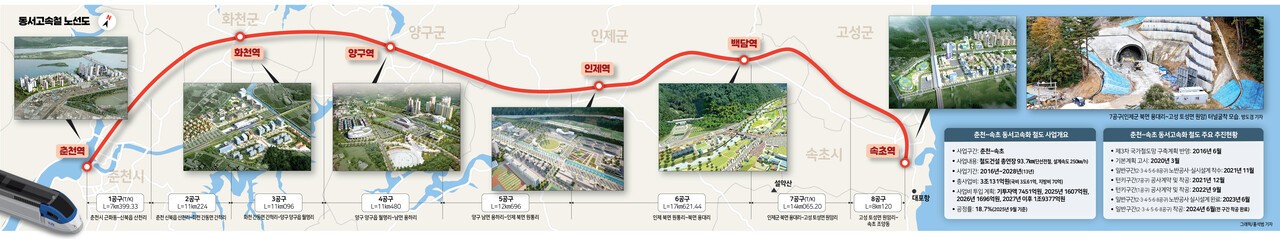 동서고속화철도 사업은 수도권과 강원 북부 산간·접경지역을 잇는 대형 철도망 구축 사업입니다. 이 노선은 수도권의 용산역에서 출발해 춘천역을 거쳐 화천·양구·인제·백담 등을 거쳐 속초역까지 이어지는 약 93.7 km 구간으로 계획되어 있습니다. (강원도민일보)